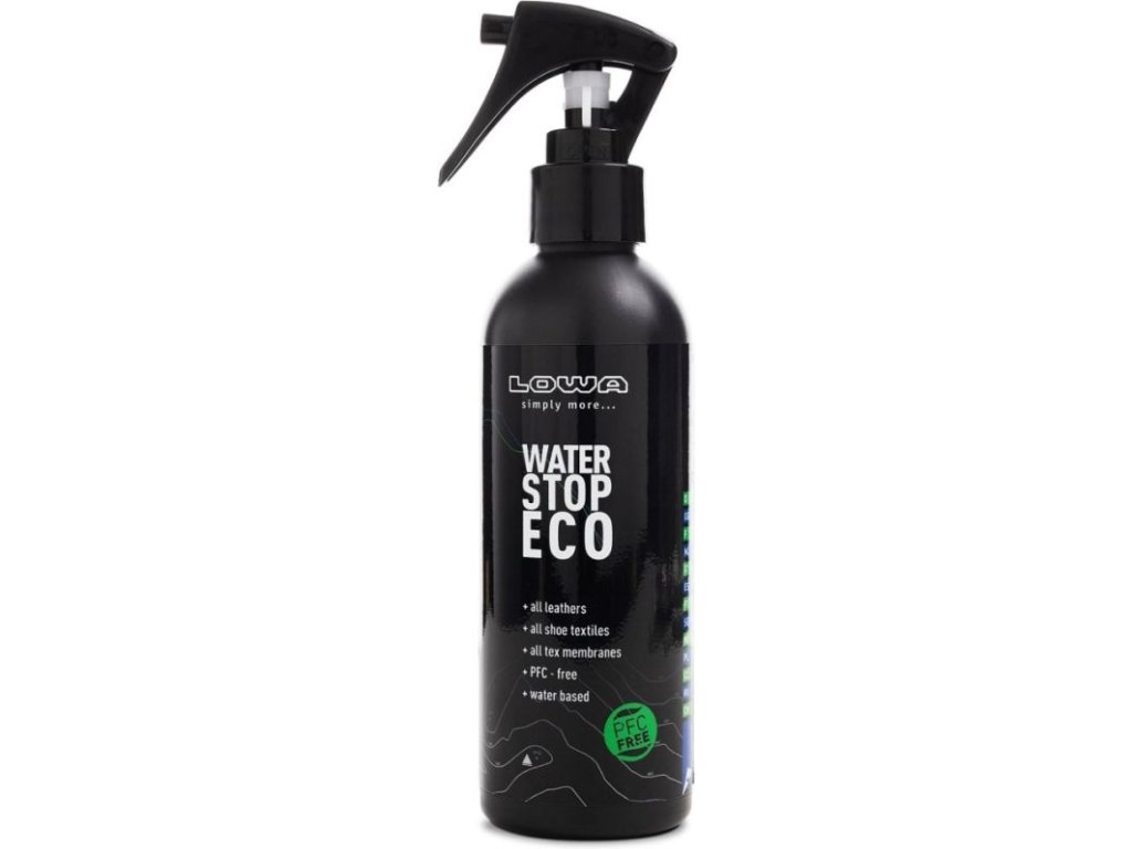 A LOWA WATERSTOP ECO egy bőrből és textilből készült cipők kezelésére szolgáló spray. A készítmény nem változtatja meg a bőr színét, és megőrzi a nubuk és velúr eredeti matt megjelenését. Azonban gyakrabban kell használni, mint a krémeket és géleket, legalább hetente egyszer a cipő használata során, és mindig minden nedves cipő szárítása után. Ez egy innovatív összetétel, amely nem tartalmaz PFC-t (teljesen fluorozott vegyületek).