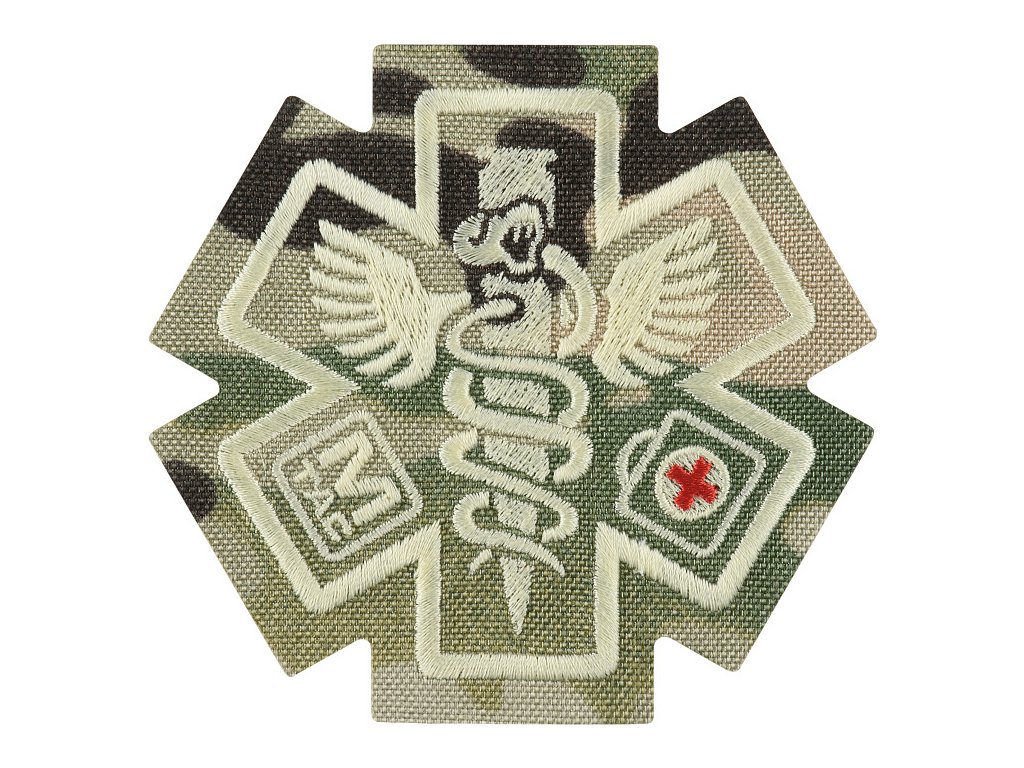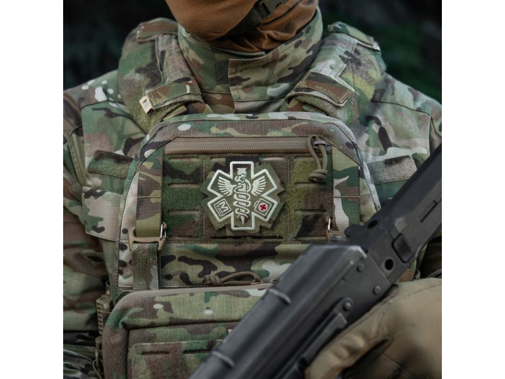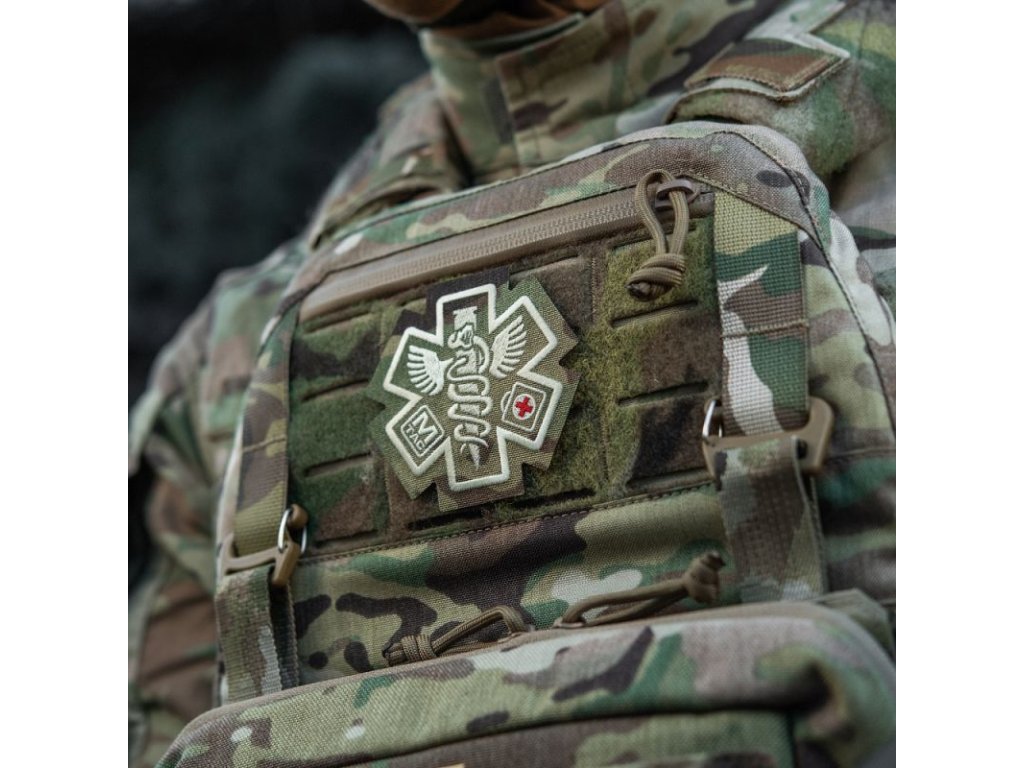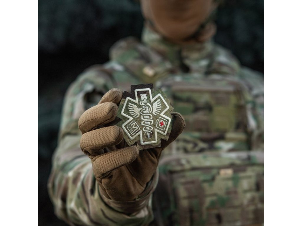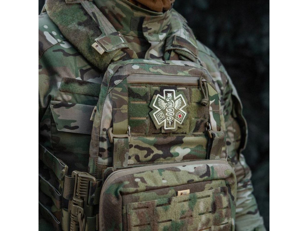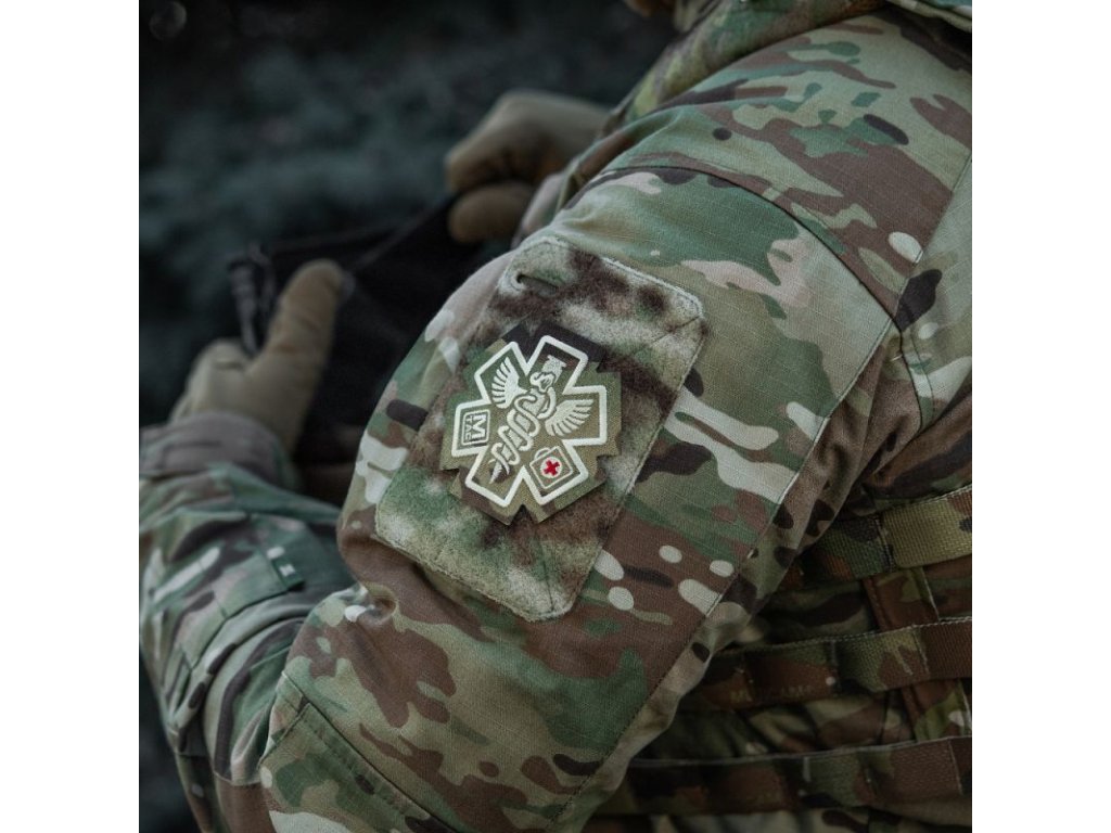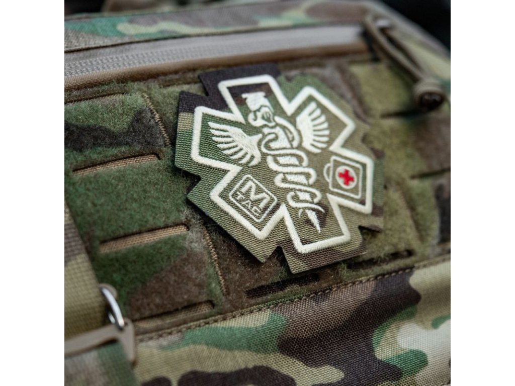 Taktikai felvarró Paramedic a M-TAC márkától a népszerű multicam kivitelben, amely feltűnő azonosító elem a terepen dolgozó egészségügyi dolgozók számára. Kombinálja a klasszikus orvosi szimbolikát a csúcsminőségű anyagokkal és kidolgozással. Kiemelkedő eleme a kaduceus – az orvostudomány ősi szimbóluma – kiegészítve az Élet Csillagával, amely a mentőszolgálat hat kulcsfontosságú tevékenységét ábrázolja. Ez a felvarró nemcsak dizájnelem, hanem fontos eszköz a gyors azonosításhoz is.