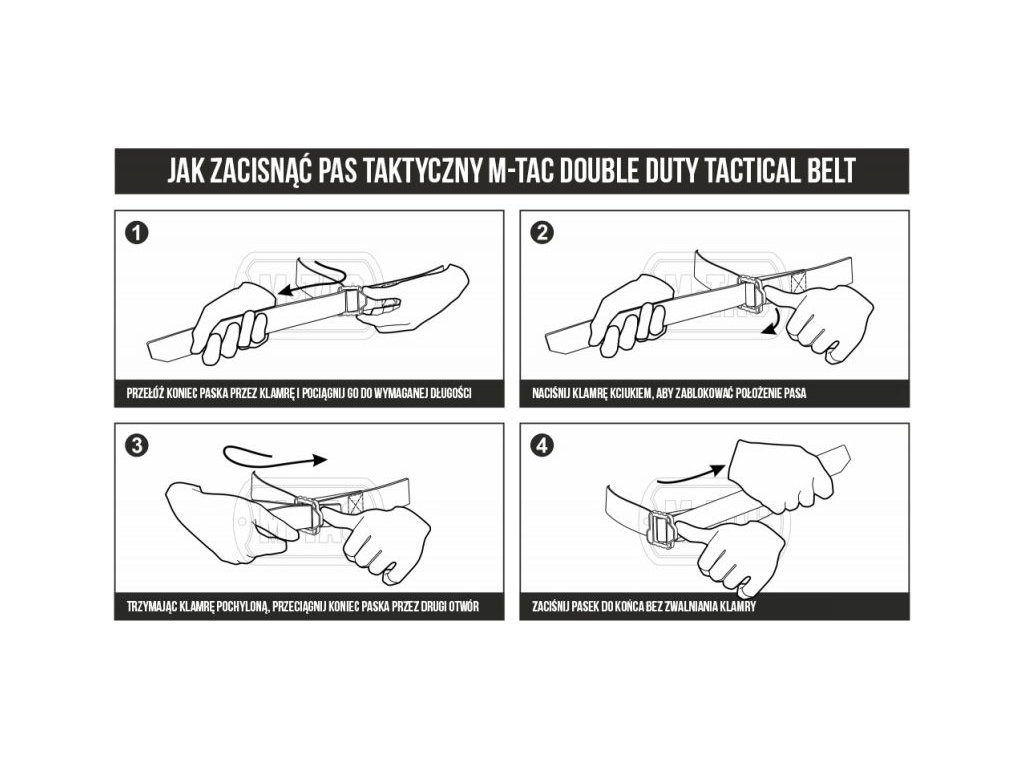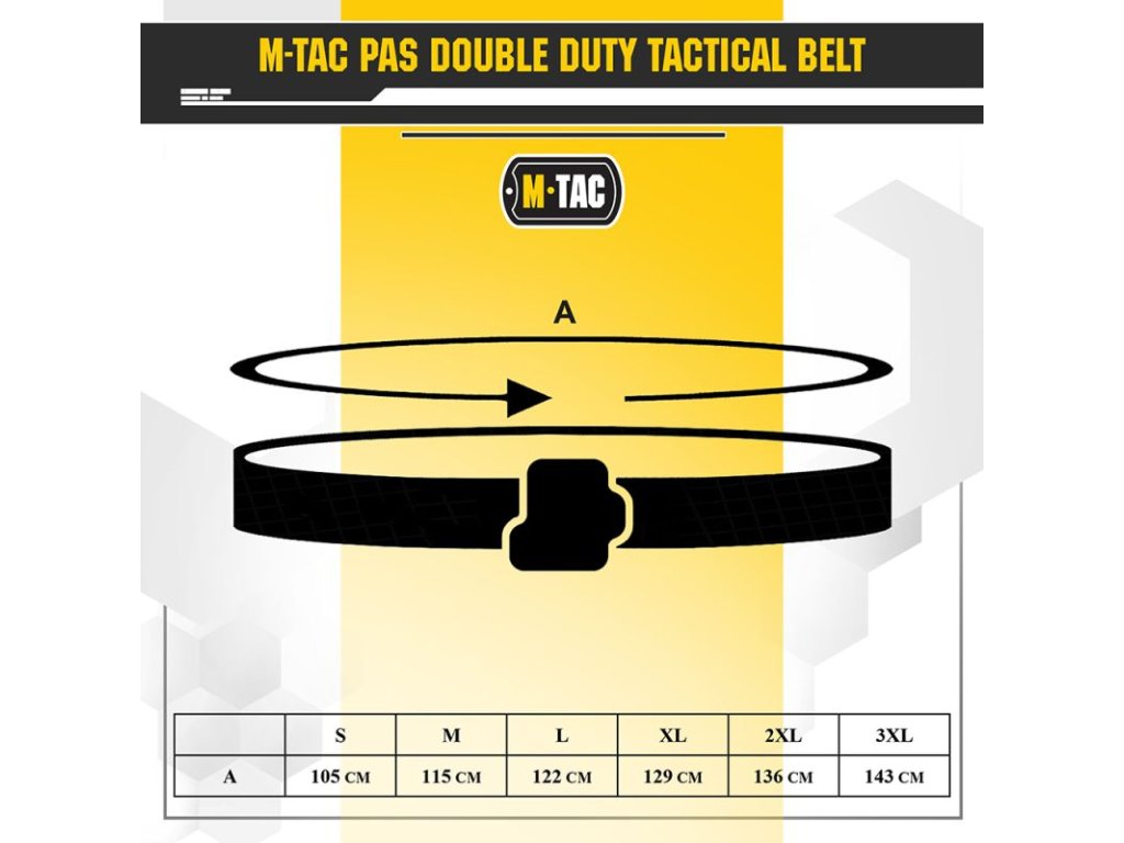 A M-Tac Double Duty taktikai öv folyamatos és hosszú távú használatra készült. Az öv két erős nejlon hevederből áll, amelyeket erős cérnával varrtak össze. Az anyag sűrűsége lehetővé teszi a tokok és táskák viselését az övön. Az öv a derékhoz univerzális, tartós polimer csattal rögzíthető.