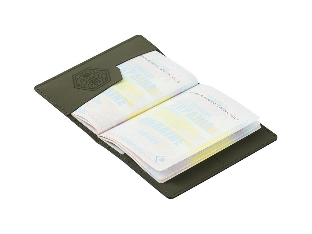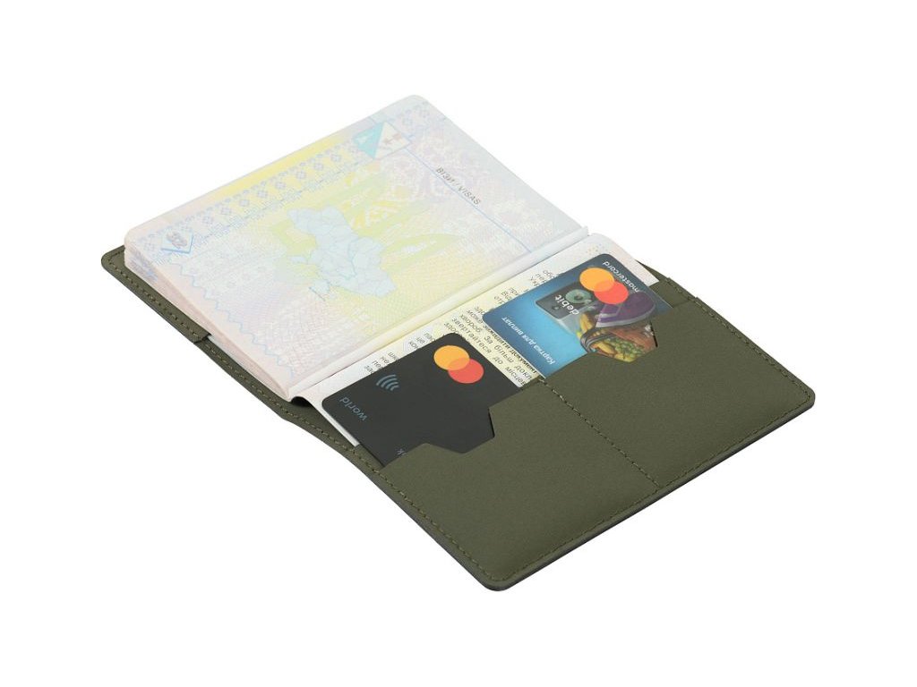 Az elülső borítón függőleges „Passport” felirat található. Belül rekeszek vannak műanyag kártyák számára és a márka stílusos logója.