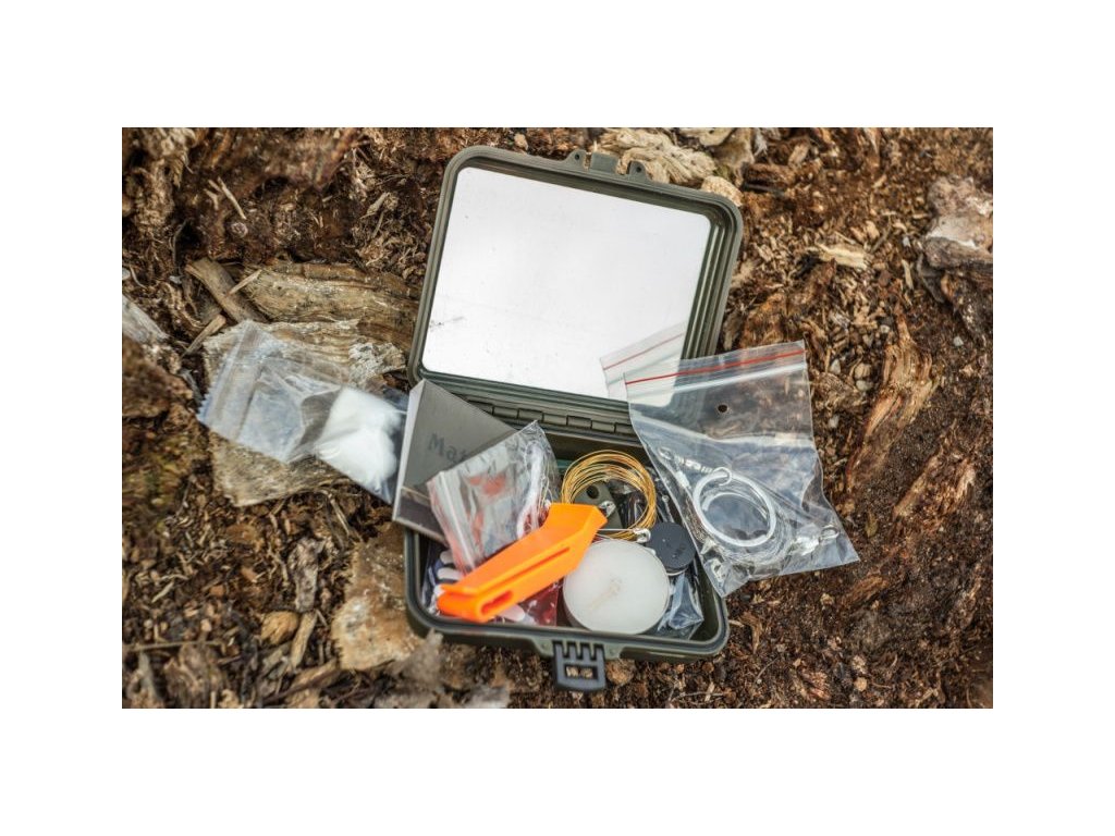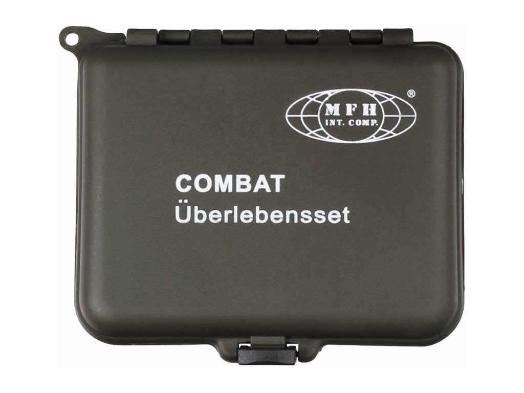 Túlélő készlet az MFH cégtől. A készlet vízálló műanyag dobozzal rendelkezik tükörrel, és tartalmaz túlélési útmutatót, jelző sípot, varrókészletet, ceruzát, biztosítótűket és horgászkészletet. Továbbá található benne vatta, gyufa, gyertya, iránytű és tűzkő, tükör, hüvelykes vészfűrész és kés.