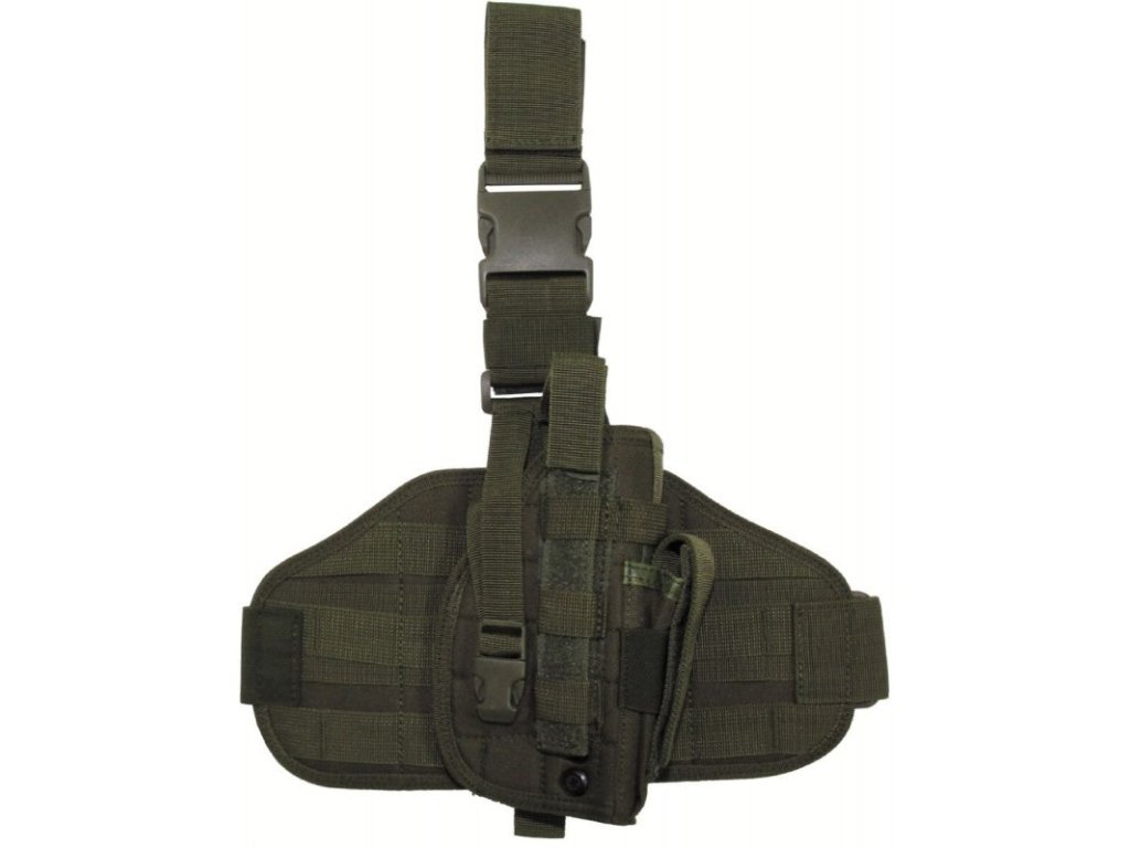 Moduláris lábtok és Molle öv egy praktikus combtok PVC sínnel, állítható övön lévő tártokkal. A tok levehető, a három soros PALS platform önállóan is használható, és a pisztoly akár háromféleképpen is rögzíthető a tokban egyszerre (FASTEX-tépőzár-fém patent), egy pisztolytár zsebbel, a combhoz és az övhöz könnyen oldható fastex csattal rögzíthető. Anyag: 100% poliészter