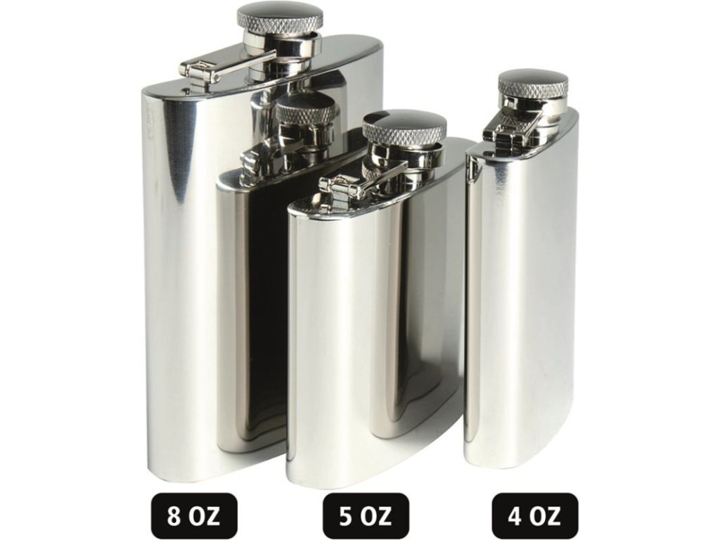 Rozsdamentes acélból készült laposüveg, polírozott felülettel, csavaros kupakkal és biztosítékkal.