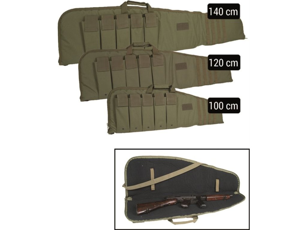 Minőségi és praktikus hordtáska fegyverhez. Klasszikus cipzárral záródik. Kipárnázott belső tér tépőzárakkal a fegyver biztonságos tárolásához. Öt nagy külső zseb tartozékok vagy tárak számára. Kis felület tépőzárral, amely lehetővé teszi különböző felvarrók vagy jelzések rögzítését. MOLLE hevederek további tartozékok rögzítésére szolgálnak. A külső hosszú pánt lehetővé teszi a vállon való hordást. A fogantyú tépőzáras burkolattal összekapcsolható, így kényelmes és biztonságos hordozást biztosít. Hosszúság: 140 cm. Szín: olíva.