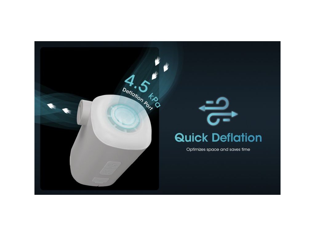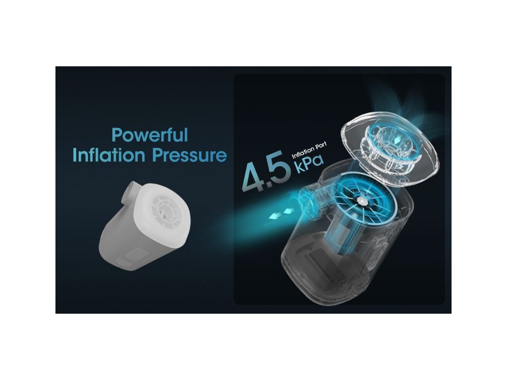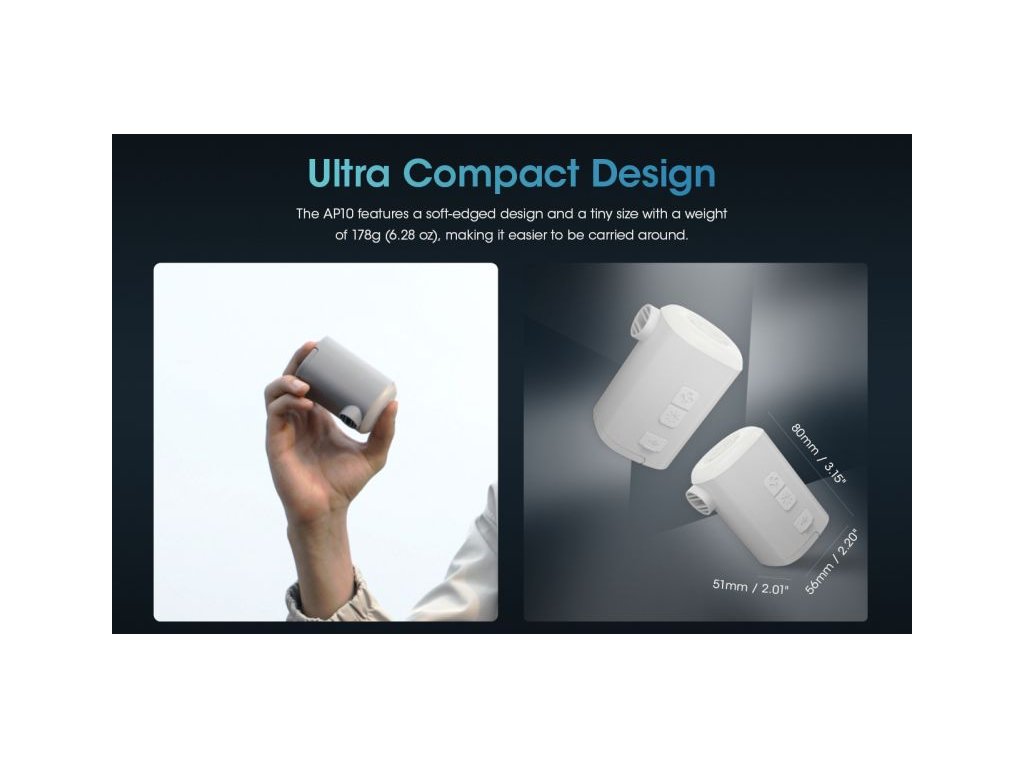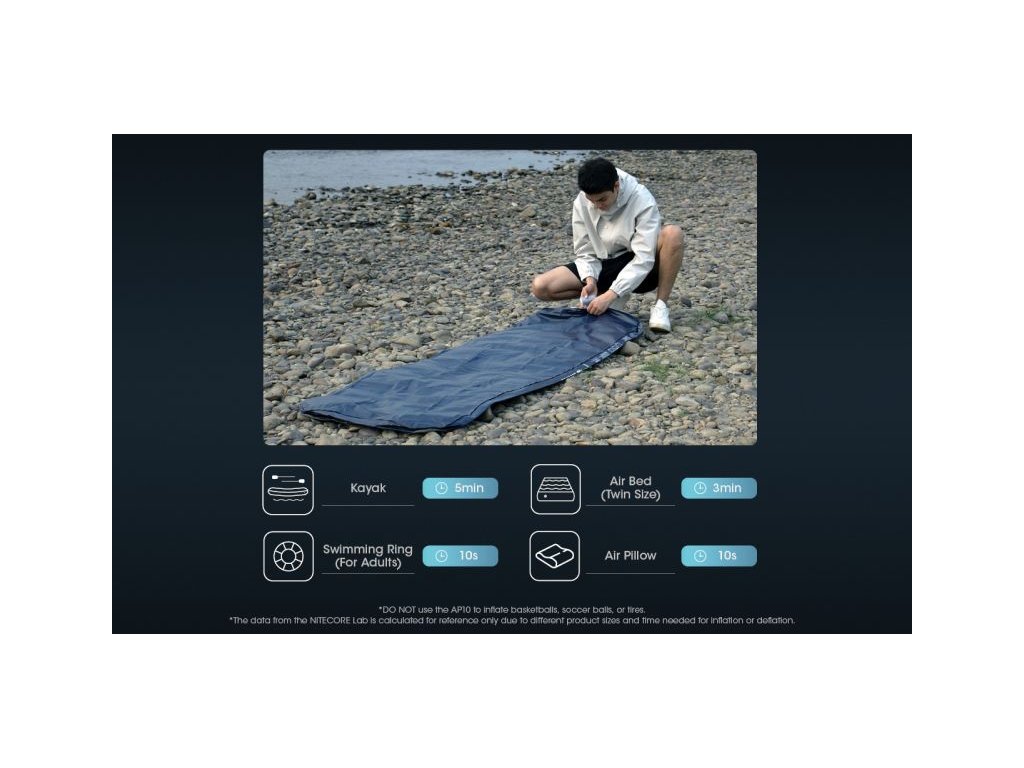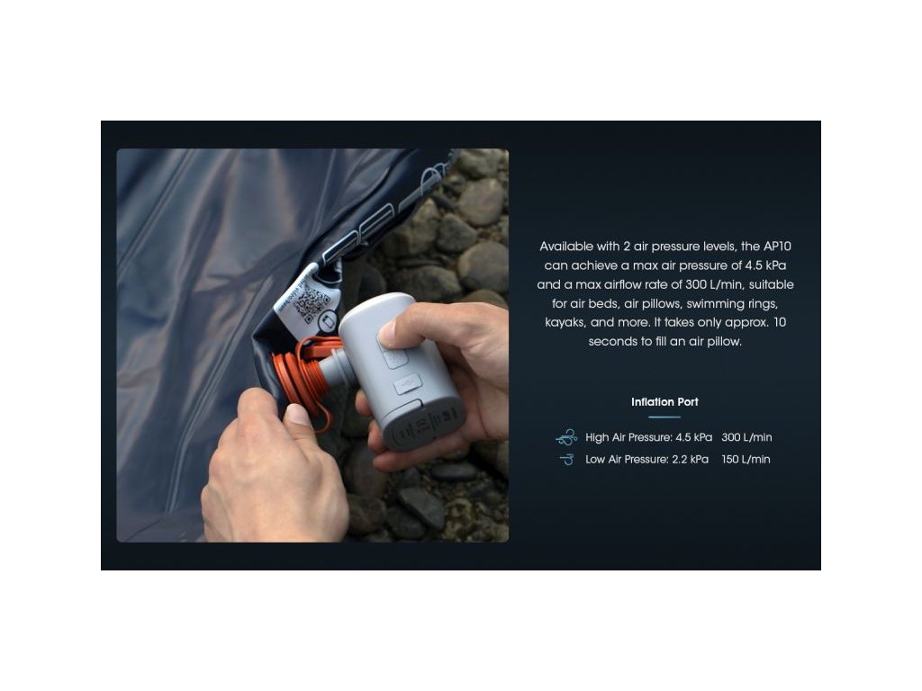 Az AP10 kompakt dizájnnal rendelkezik lekerekített élekkel, amely képes maximális légnyomást előállítani 4,5 kPa és maximális légáramlást 300 l/min. Továbbá rendelkezik világítási móddal, amelynek maximális fényereje 300 lumen. 4 fúvókával van felszerelve, amelyek kompatibilisek különböző termékekkel, amelyek szükségesek a felfújáshoz vagy leeresztéshez.