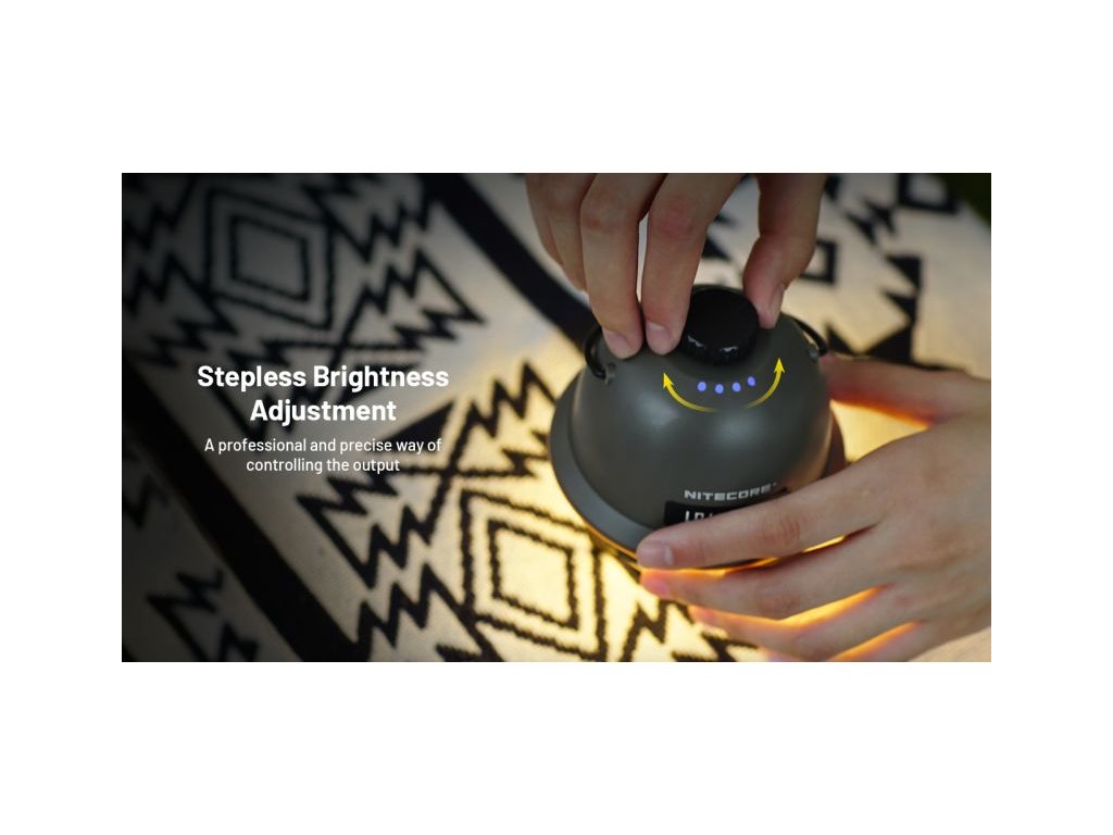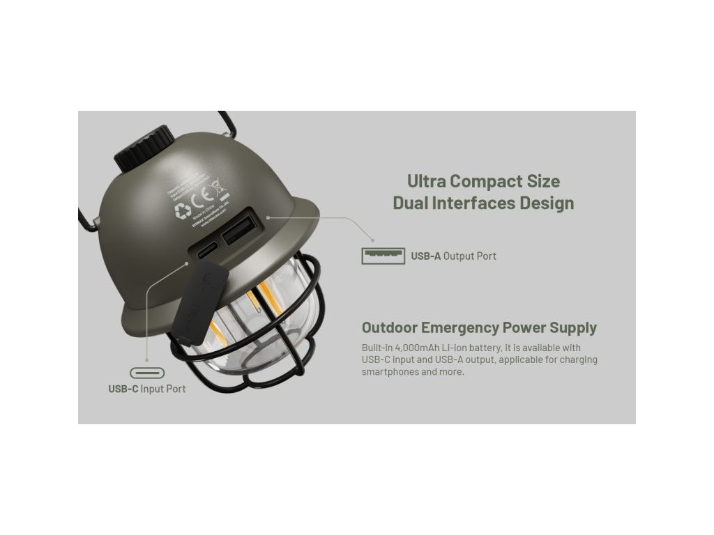 A multifunkcionális kempinglámpa USB-C-vel 3 féle fénytípussal és fokozatmentes fényerő-szabályozással rendelkezik, maximális üzemidővel 65 óráig. USB-A és USB-C kimenettel is rendelkezik, powerbankként is használható okostelefonok töltésére.