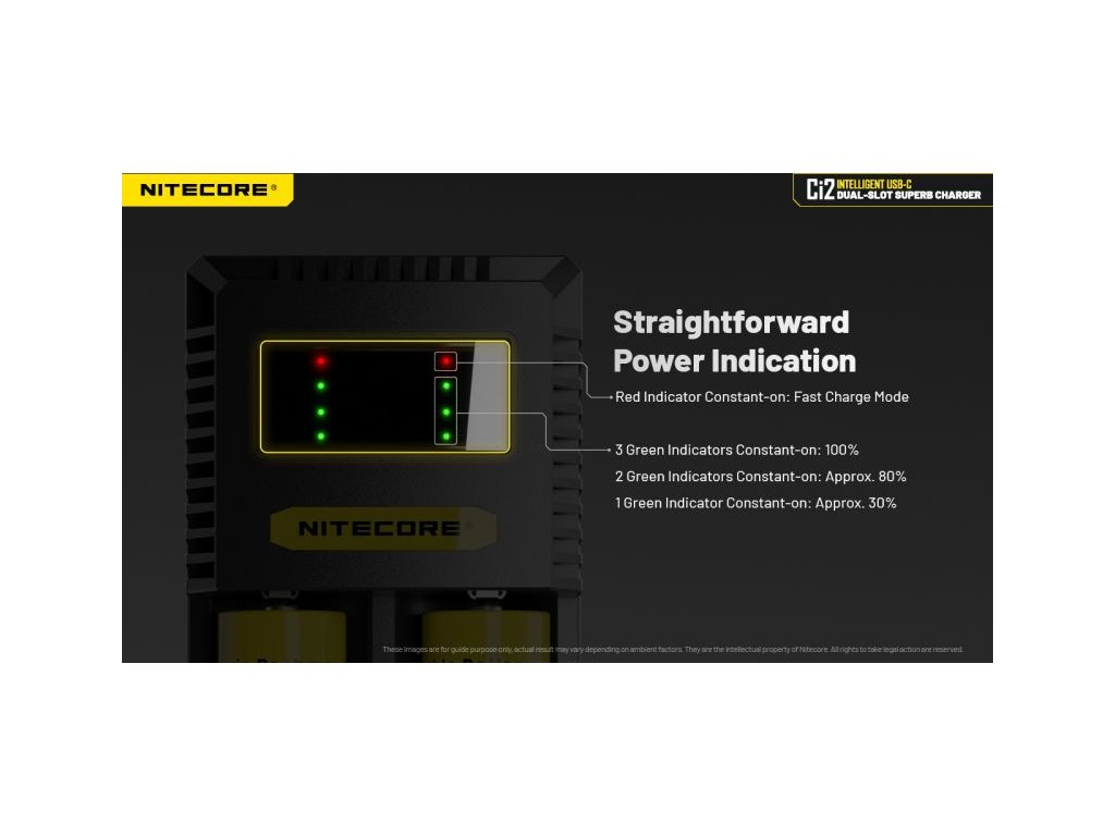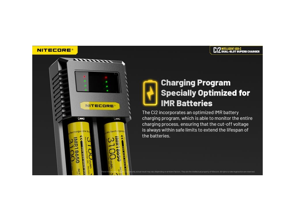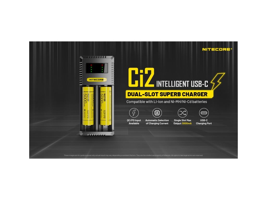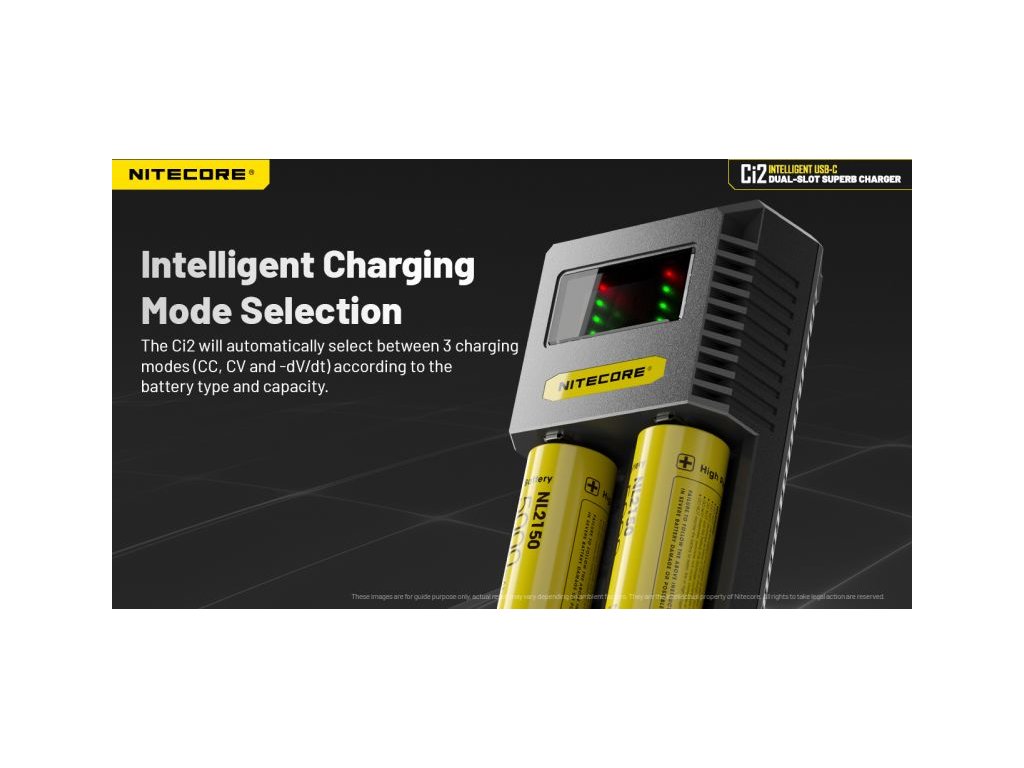 Univerzális intelligens töltő USB-C-vel, szinte minden típusú akkumulátorral kompatibilis (beleértve a 21700 mAh-t is), így elkerülheti több töltő birtoklását. A Ci2 töltő automatikusan felismeri a Li-ion, Ni-MH és Ni-Cd újratölthető elemeket, a LiFePO4 elemek kézi kiválasztásával pedig alkalmazza a megfelelő töltési módot. Minden mikroprocesszor által vezérelt töltőhely képes az akkumulátor önálló megfigyelésére és töltésére.