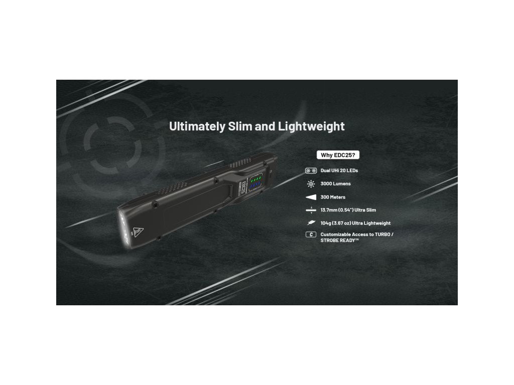 Ultravékony taktikai zseblámpa digitális kijelzővel, amely kiváló minőségű LED diódákat használ, 2x UHI 20 LED. Maximális teljesítmény akár 3000 lumen. Magas hatékonyságú elektronika. Maximális üzemidő akár 55 óra. Intelligens töltőáramkör feszültségérzékeléssel, biztonságosan és gyorsan tölt. Az integrált USB-C aljzat víz-, por- és ütésálló.