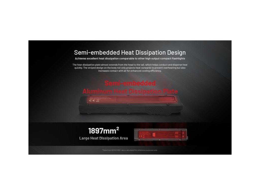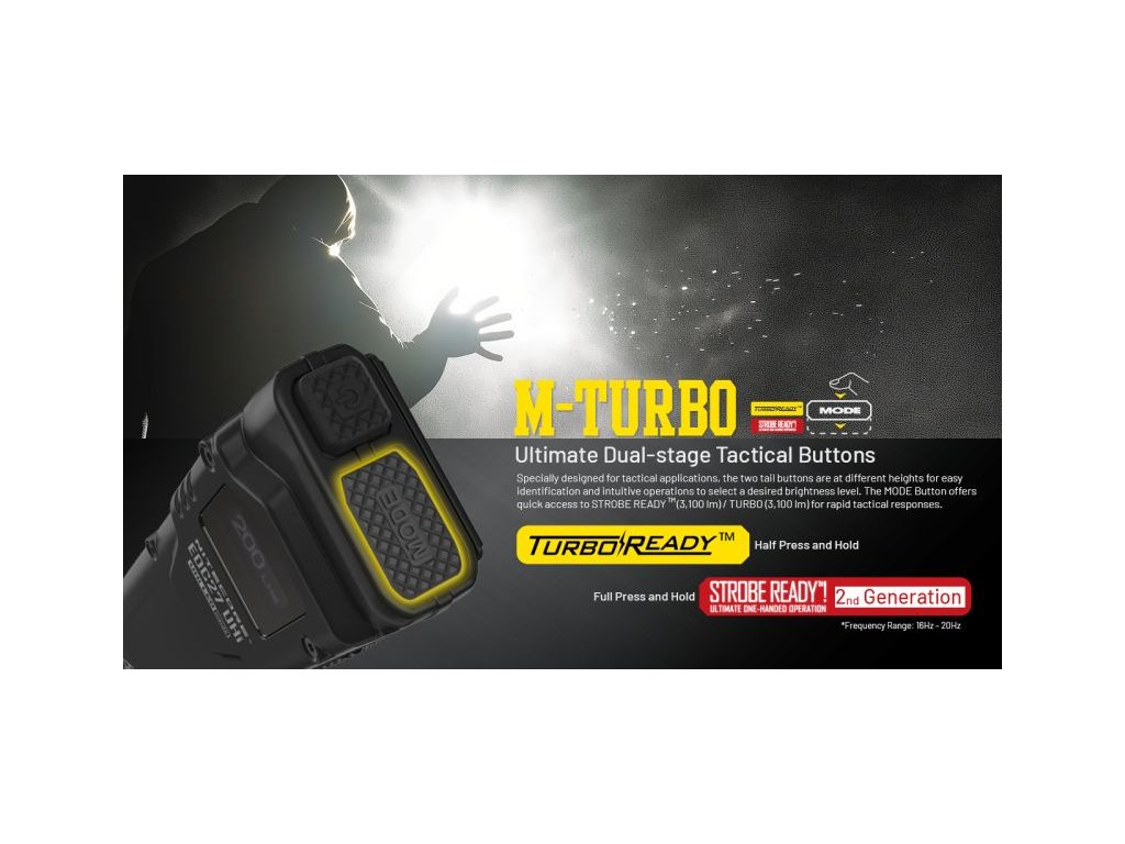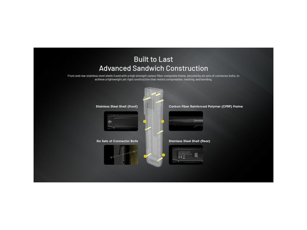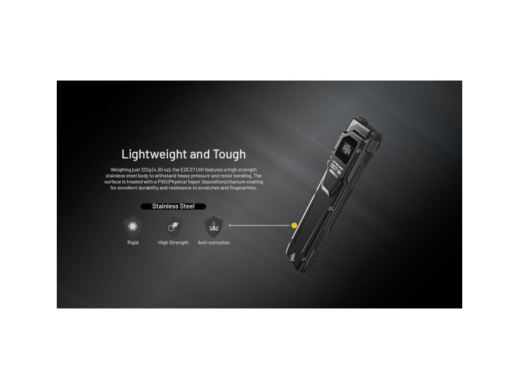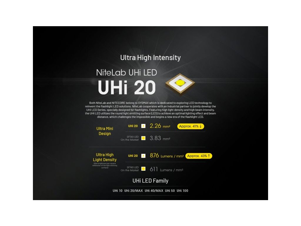 Ultravékony taktikai zseblámpa digitális kijelzővel, amely kiváló minőségű LED diódákat használ 2 x NiteLab UHi 20. Maximális teljesítmény akár 3100 lumen. Magas hatékonyságú elektronika. Maximális üzemidő akár 55 óra. Intelligens töltőáramkör feszültségérzékeléssel, biztonságosan és gyorsan tölt. Az integrált USB-C aljzat víz-, por- és ütésálló.