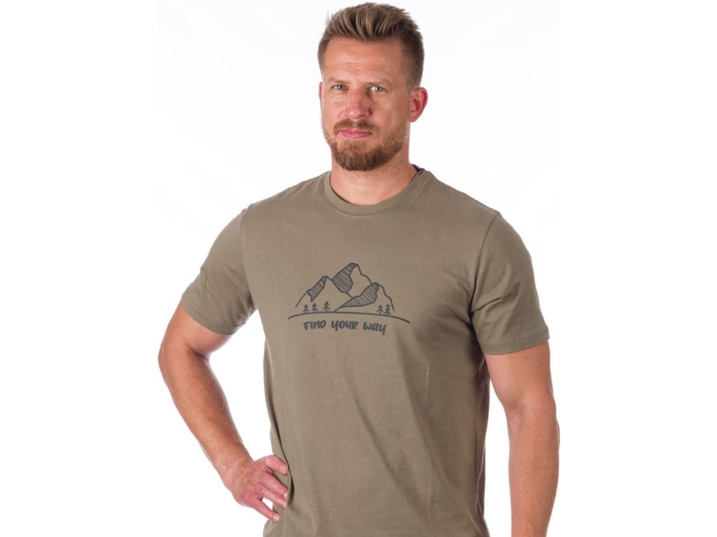 Férfi nyári póló klasszikus szabással, amely megfelelő választás különféle szabadidős tevékenységekhez, akár a városban, akár a hegyekben. A pólót eredeti nyomtatás díszíti erdős táj motívummal. A könnyű pamut kötött anyag szilikon-enzimes előmosással van kezelve, amelynek köszönhetően az anyag megőrzi formáját és kellemes tapintású. A rövid ujjú és kerek nyakú póló minden testtípushoz alkalmas. A nyakrészen lévő fedővarrás és a lapos vállvarrások védelmet nyújtanak a kellemetlen dörzsölés ellen hátizsák viselésekor.
