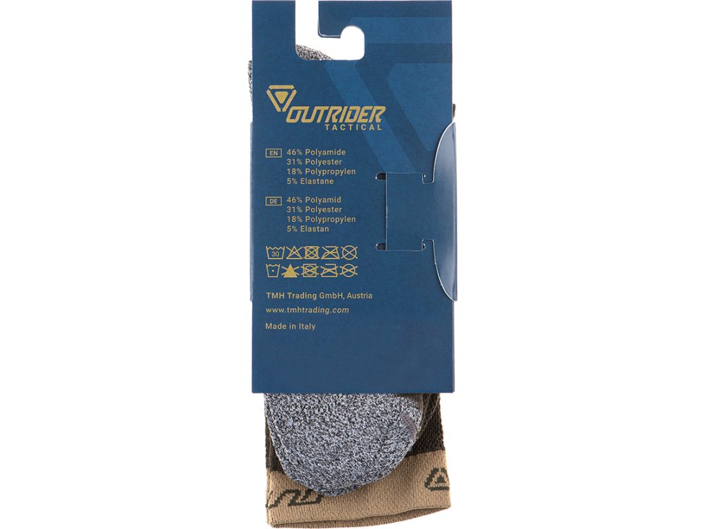 Az Outrider Tactical Performance sorozat zoknijai kényelmükről és jó szabásukról ismertek. A zónás kialakítást az EDC, a Range és a Law Enforcement kényelmi követelményei szerint helyezték el. Az anyagösszetétel 47% poliamid, 26% poliészter, 23% polipropilén és 4% elasztán, ami meghosszabbított élettartamot és gyors izzadságelvezetést biztosít, így a láb a lehető legszárazabb marad.