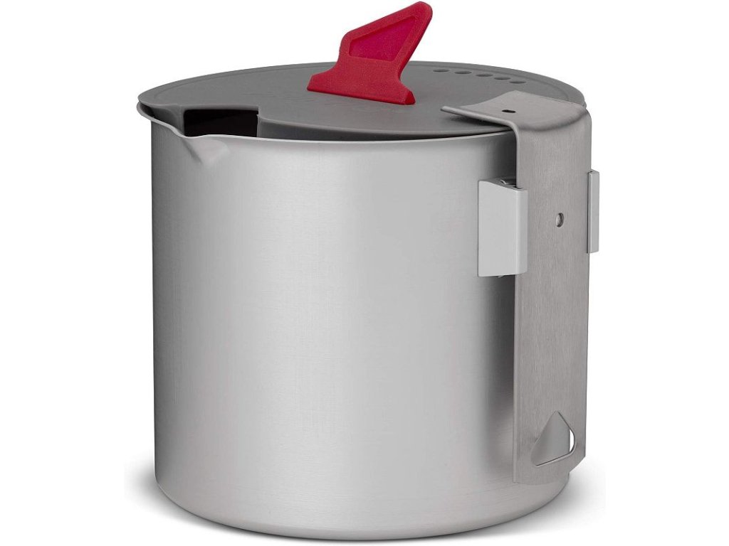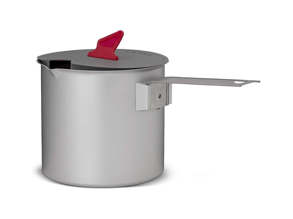 A fedél könnyű műanyagból készült szilikon fogantyúval, és egyben szűrőként is szolgál. Maga az edény levehető fém fogantyúval rendelkezik, amelyet két különböző pozícióban lehet az edényhez rögzíteni. Összeszerelve az edény a fedéllel együtt marad, és minimális helyet foglal. A Trek Pot edény belső oldalán térfogatjelzőkkel van ellátva. Praktikus és erős hálós táskával szállítják a szállításhoz.
