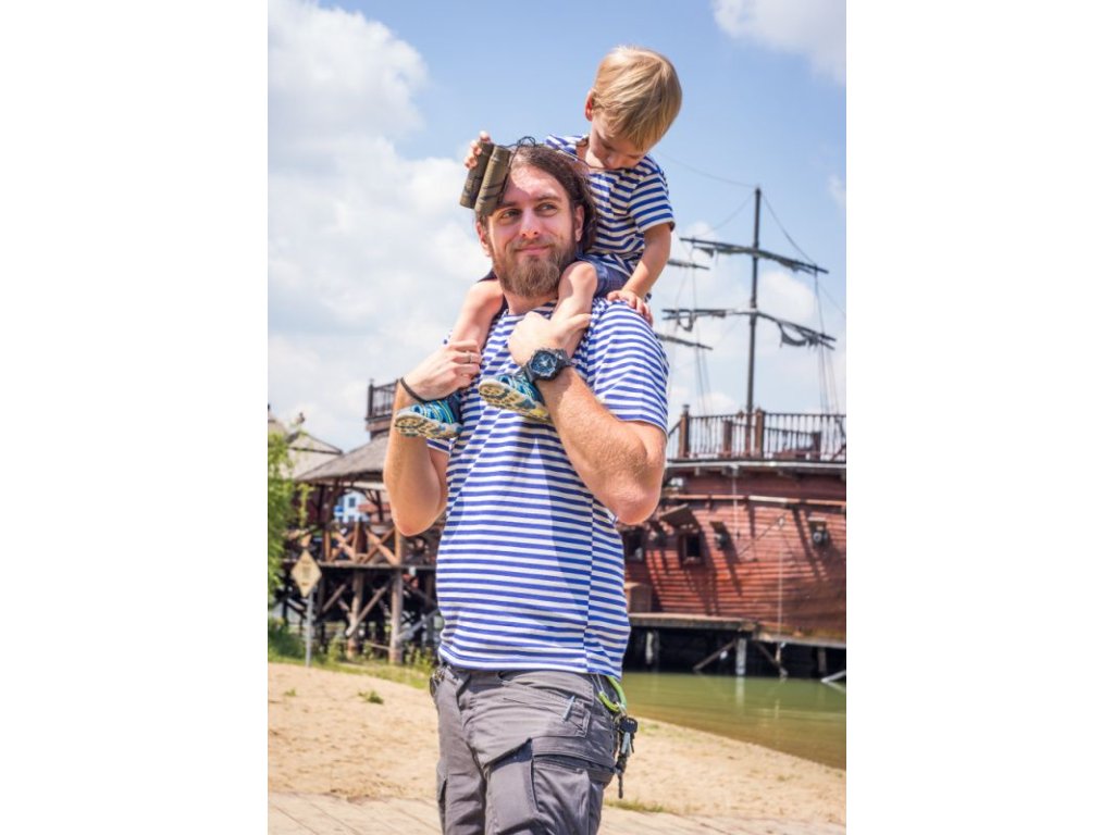 Gyermek matróz póló rövid ujjú, fehér és világoskék színkombinációban. A póló tapintásra nagyon kellemes. Kettős kötésű rendszer. Ideális ajándék minden kis matróznak.