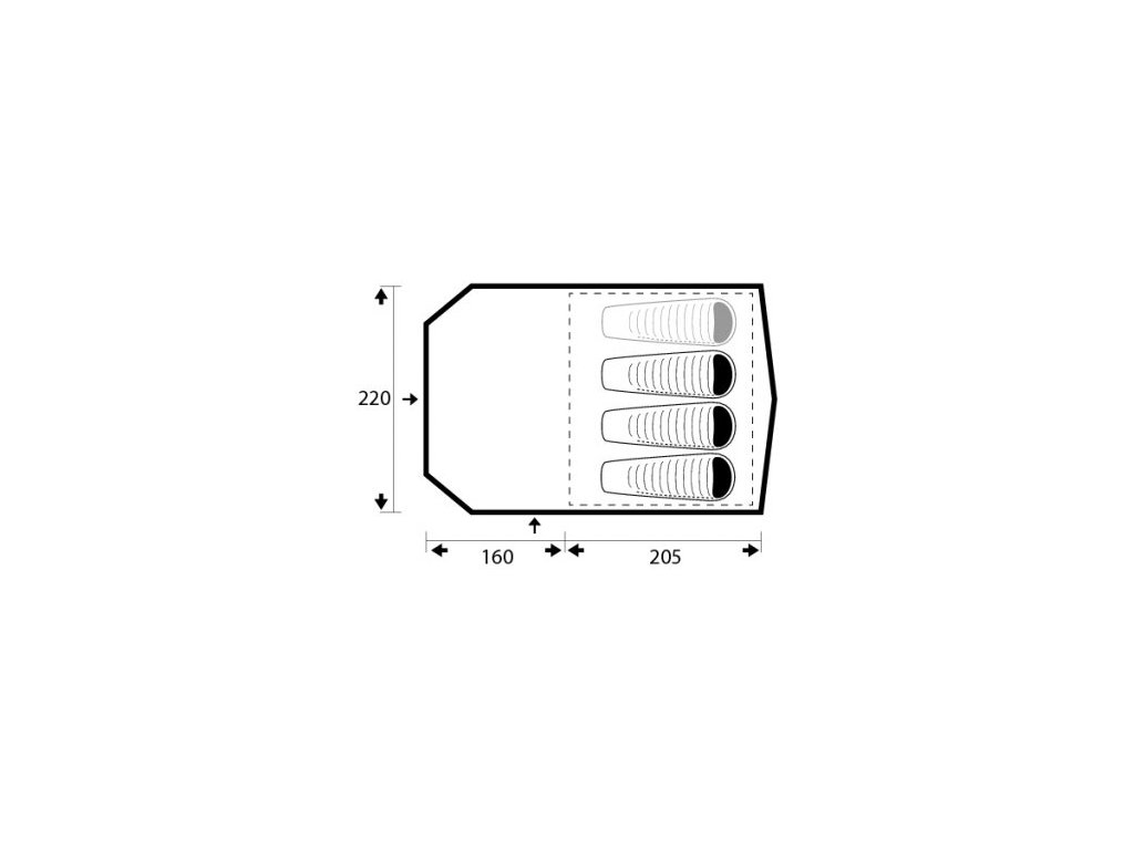 3-4 személyes sátor nagy és jól megközelíthető előtérrel, amelyet két oldalról is ki lehet nyitni. A tér vészhelyzeti alvásra vagy kerékpárok és hasonlók tárolására is használható. A sátor családi nyaralásokhoz is alkalmas. A sátor előnye a megfelelő kényelem és a sokoldalú használat.