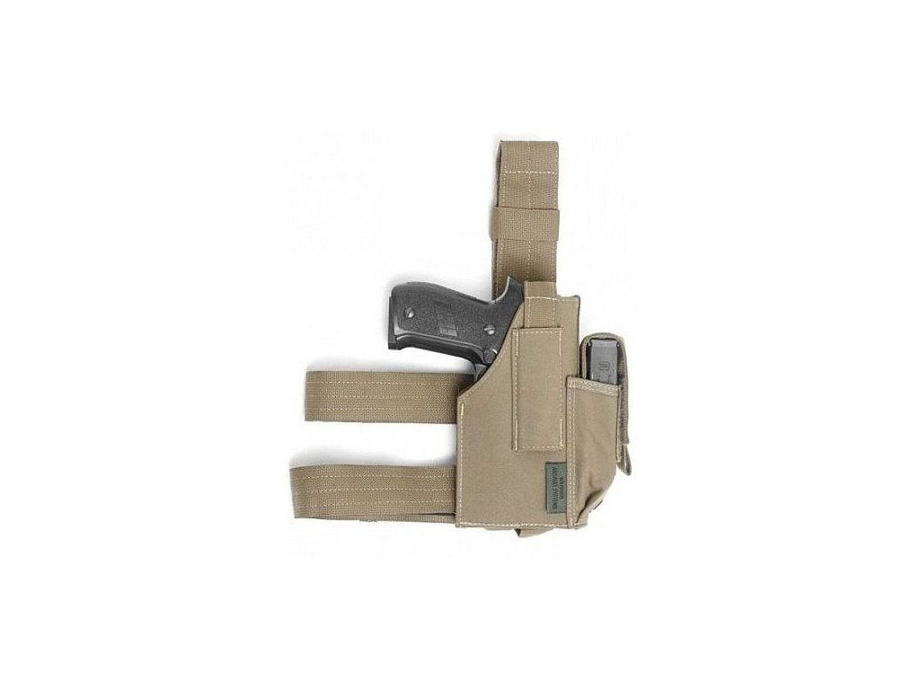A Warrior Drop Leg teljesen állítható combtok a legtöbb pisztolyt befogadja. A tok az övhöz egy magasságban állítható hurokkal rögzíthető, a combhoz pedig két teljesen állítható szalaggal, gyorskioldó csatokkal van rögzítve. Eredeti Mil-Spec anyagok. Cordura, hevederek, csatok, kapcsok és műanyag kiegészítők, rugalmas zsinórok vagy kötelek úgy vannak kezelve, hogy minimalizálják a fényvisszaverődést az infravörös spektrumban (I.R. Signature). A gumis zsinórok vagy rugalmas kötelek megfelelnek a legmagasabb US Mil Spec követelményeknek a napsugárzással szembeni ellenállás terén.