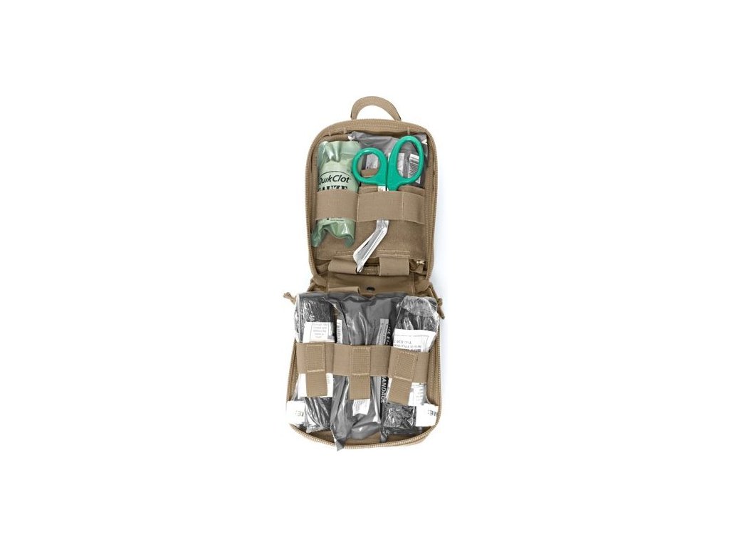 Az elsősegélytáska tokja képes befogadni: 2 CAT tourniquet, 2 nyomókötés, 2 QuickClot kötés, Bolin mellkas perforációs záróeszköz, légúti átjáró, olló és további eszközök.