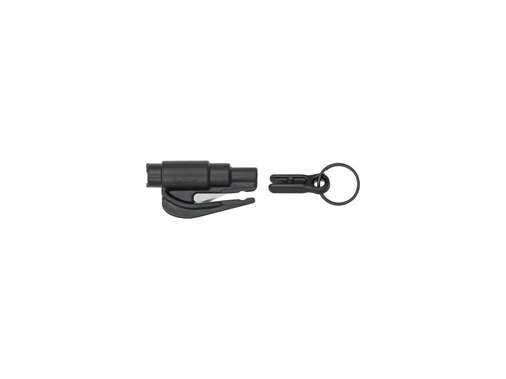 Keychain pendant made of plastic containing a seatbelt cutter and a spring-loaded glass breaker.