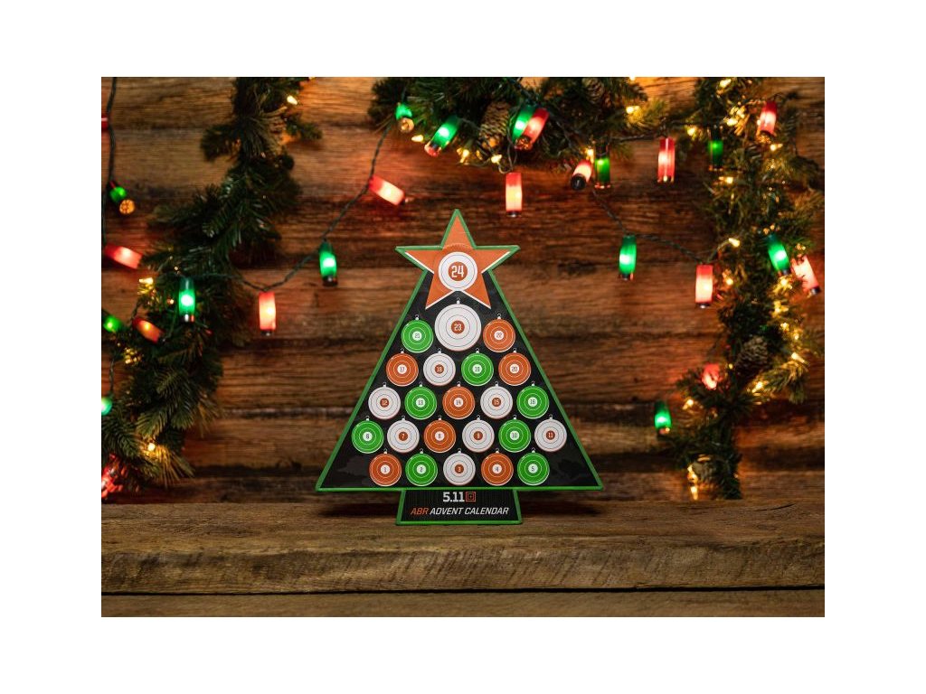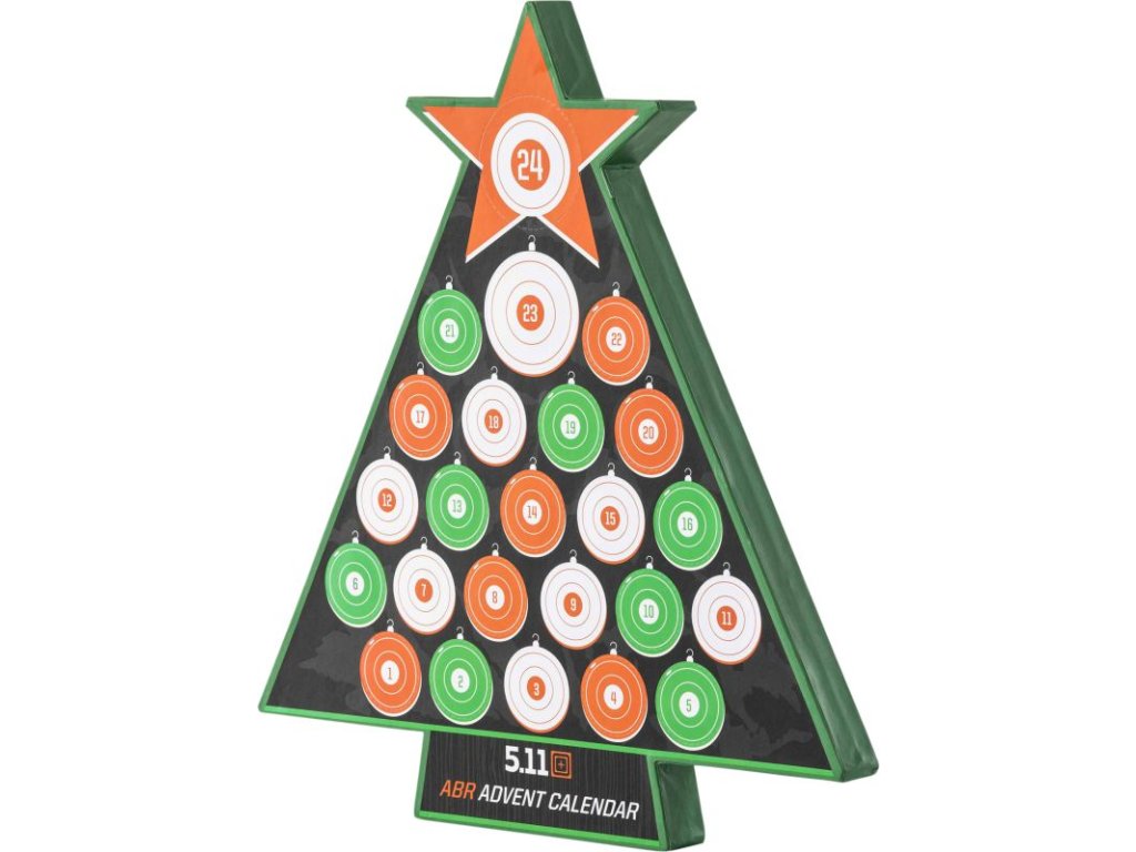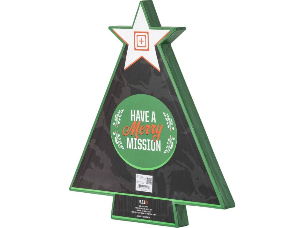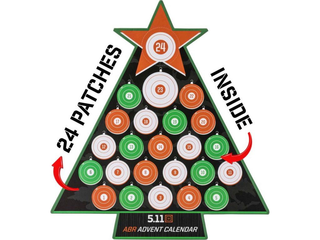 Adventný kalendár 5.11 Merry Mission v tvare vianočného stromčeka s 24 nášivkami s prekvapením v limitovanej edícii. Všetky gumené nášivky sú na zadnej strane vybavené suchým zipsom na pripevnenie na plochy so suchým zipsom určené na tento účel.