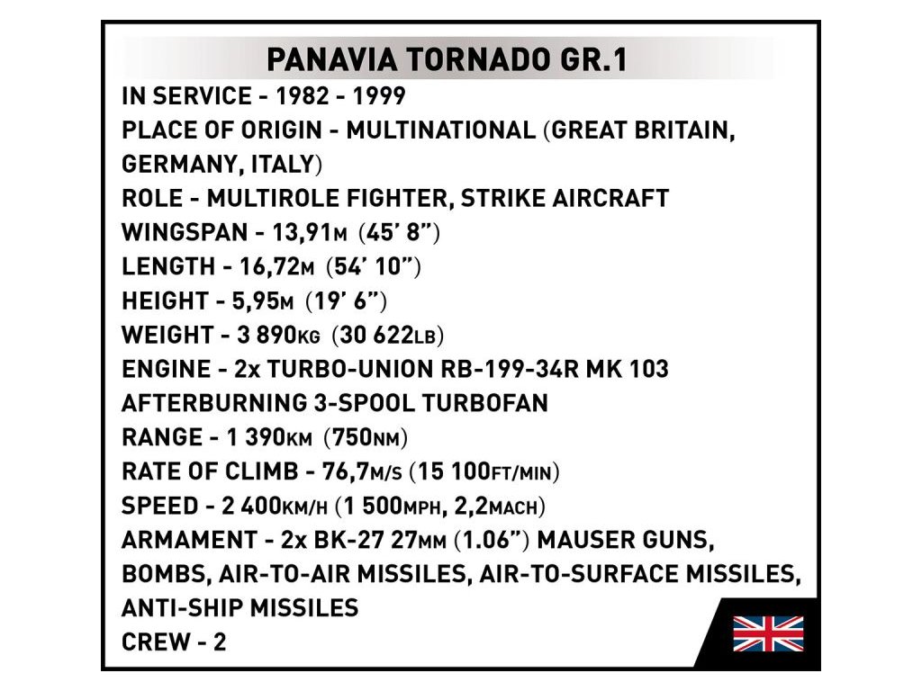 Stavebnica modelu nadzvukového stíhacieho bombardéra Panavia Tornado GR.1, ktorý vznikol v spolupráci Veľkej Británie, Nemecka a Talianska. Model je zhotovený v typickej šedo‑zelenej kamufláži RAF a disponuje nastaviteľnou geometriou krídel, pohyblivými výškovkami a otváracím krytom kokpitu pre umiestnenie dvoch figúrok pilotov. Pod krídlami a trupom sú umiestnené palivové nádrže, rakety a bomby. Model môže stáť na odnímateľnom podvozku alebo na stojane s popisom, ktorý je súčasťou balenia.