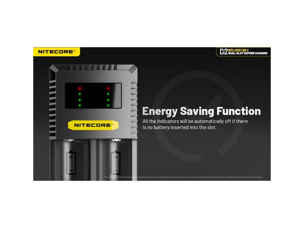 Univerzálna inteligentná nabíjačka s USB-C, kompatibilná s takmer všetkými typmi akumulátorov (aj 21700 mAh), čím sa vyhnete potrebe vlastniť viacero nabíjačiek. Nabíjačka Ci2 dokáže automaticky rozpoznať Li-ion, Ni-MH a Ni-Cd nabíjacie batérie, cez ručný výber LiFePO4 batérie a aplikovať tak vhodný režim nabíjania. Každý mikroprocesorom riadený nabíjací slot je schopný sledovať a nabíjať batériu samostatne.