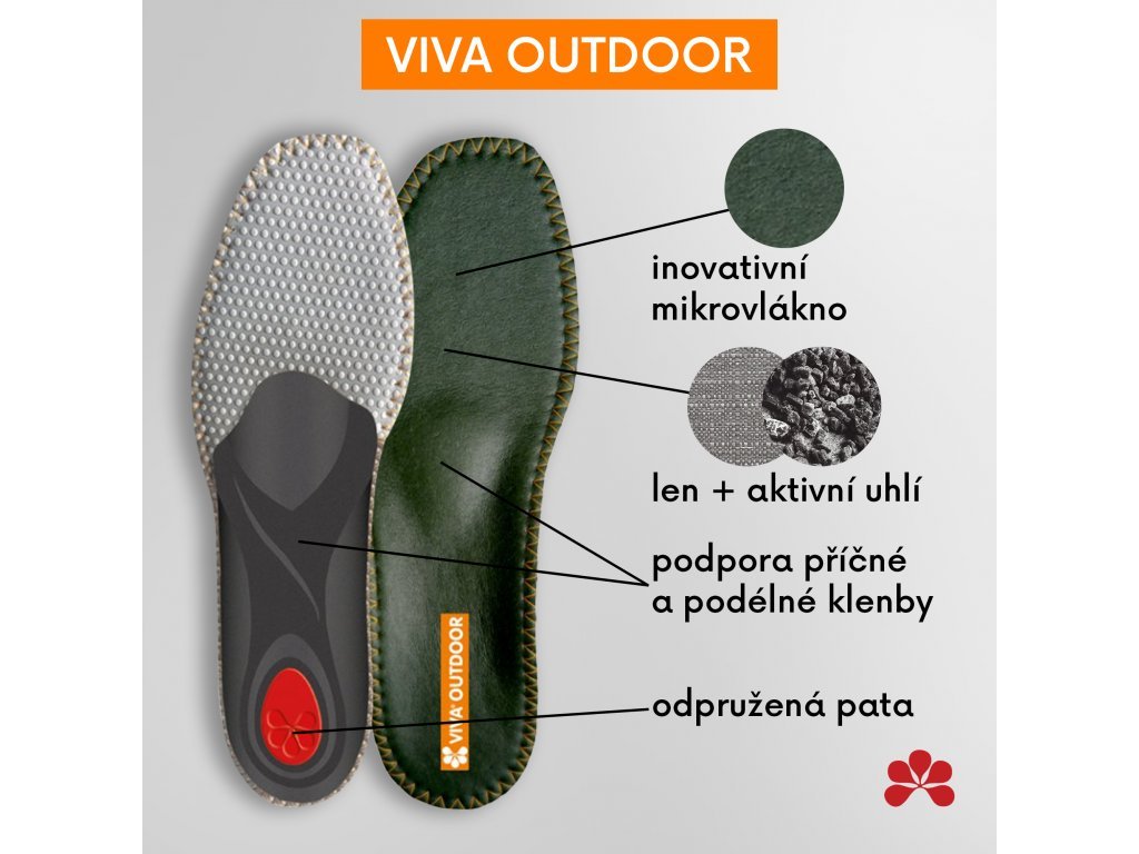 Hygienická stabilizačná ortopedická vložka pre vaše outdoorové aktivity. Či už sa venujete turistike alebo vonku pracujete, nech ju budete nosiť v pohorkách alebo teniskách: kombinácia týchto materiálov vytvára príjemnú klímu vo vnútri topánky a je prispôsobená na záťaž práve pri nosení vonku. Viva Outdoor, založená na špecifickej konštrukcii Viva, môže predchádzať problémom s nohami alebo zmierňovať už vzniknuté problémy. Je aj deálna pre ploché nohy, plantárnu fascitiídu, problémy s kolenami a chrbtom av neposlednom rade aj ako prevencia.